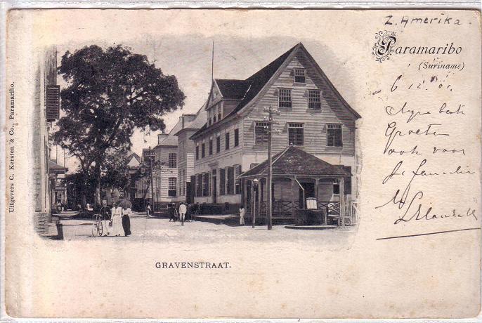 Gravenstraat Paramaribo, rond 1900. Rechts het statengebouw, gebouwd omstreeks 1718, afgebrand in 1996.
